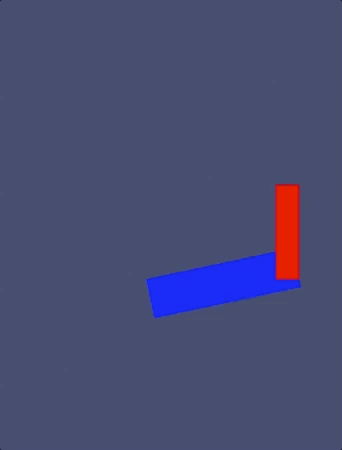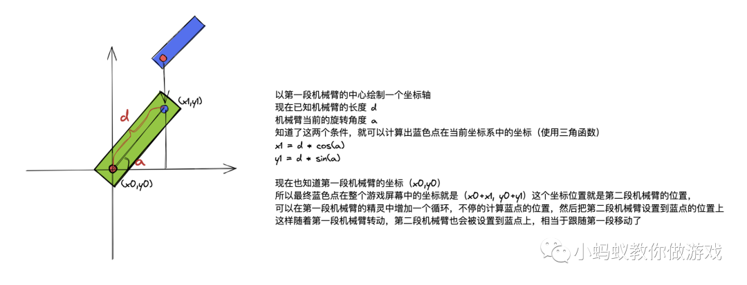 再举个应用的例子:有两段机械臂,绿色的机械臂可以通过摇杆控制旋转,现在需要蓝色的机械臂上红点的位置,始终位于绿色机械臂蓝点的位置上,让蓝色机械臂始终跟随着绿色的机械臂进行旋转。