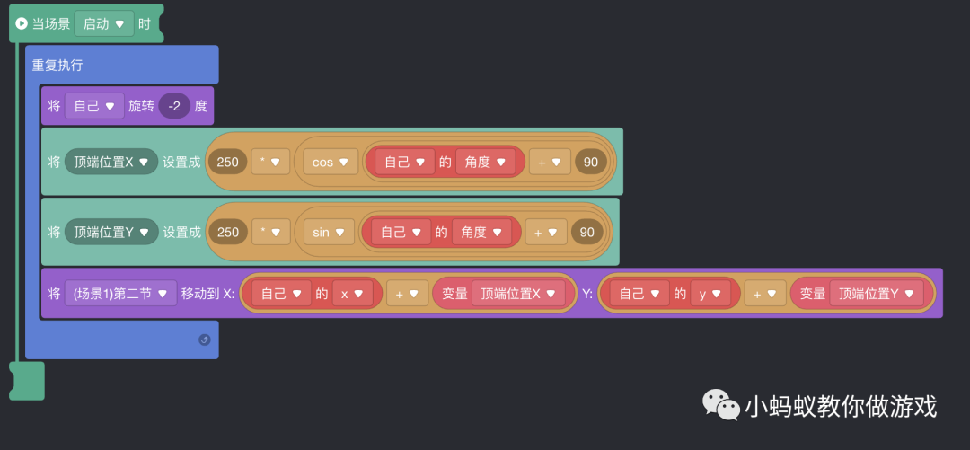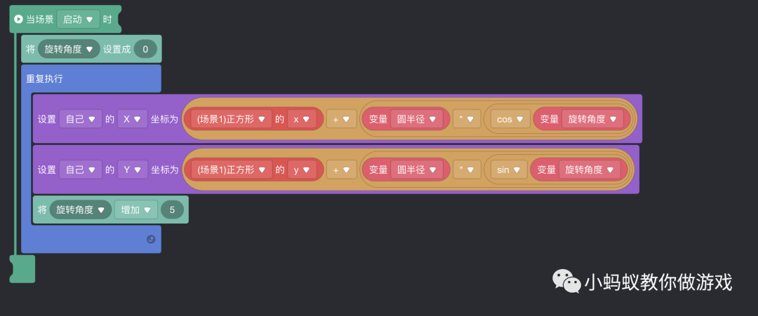 在旋转的过程中,角度 a 是在不断的变化的,可以利用三角函数中的正弦函数和余弦函数来计算出蓝色方块的位置坐标,这样在循环中通过不停的设置蓝色方块的坐标就能够实现绕圈的圆周运动。