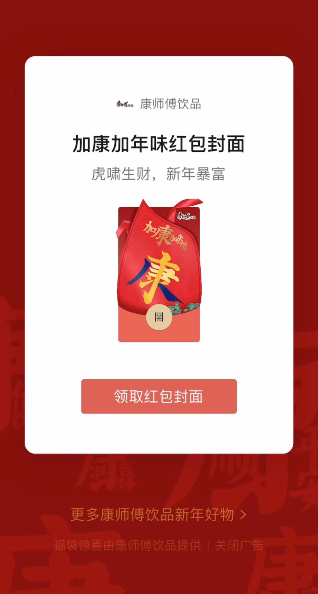随着社交互动、红包玩法、场景嵌入的热潮,微信场景的创意交互受到越来越多品牌的重视。此次,康师傅饮品为打造独特节日仪式感,从品牌名“康”字入手,将祝福与“康”字融合,用户只要在微信对话框中发送 “康师傅”、“祝你康来运转”、“新年加康加年味”、“见康赢好礼”中任意一个关键词,就可触发品牌表情雨彩蛋。品牌在彩蛋中巧妙埋藏了品牌异形红包封面、现金红包、活动小程序三条差异化链路,为用户带来了全新营销体验。