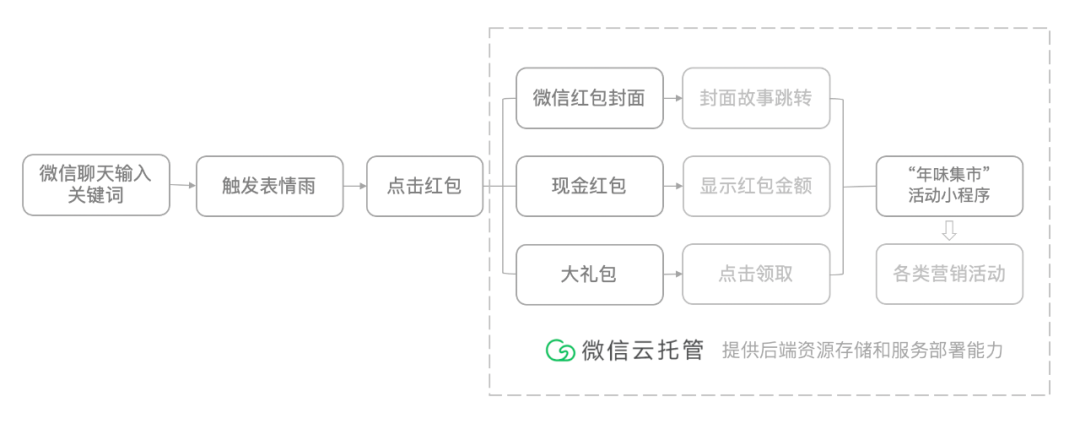 一部分,活动配套的小程序使用云托管作为后台服务端;另一部分是借助云托管的静态资源存储功能,稳定承载了海量用户访问的静态资源页,用户点击表情雨中的福袋,就会跳转到该页面,可进一步完成领取红包封面、跳转小程序等多种操作。