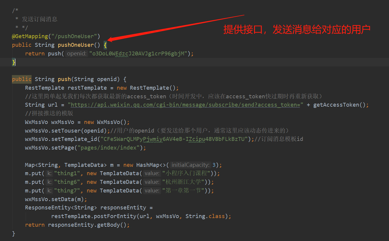 这些都定义好以后,我们就可以提供一个服务给到Java的其他代码调用,或者提供一个接口供外界传入openid,然后给对应的用户推送消息了。