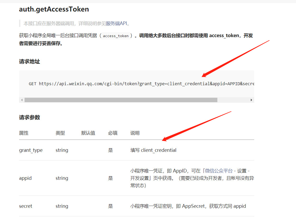 grant_type是一个固定的值,只有appid和secret是需要我们填入的,这两个值在我们的小程序后台就可以拿到,我也有录视频教大家如何拿到,如果不知道怎么获取的同学可以取看下我的视频。