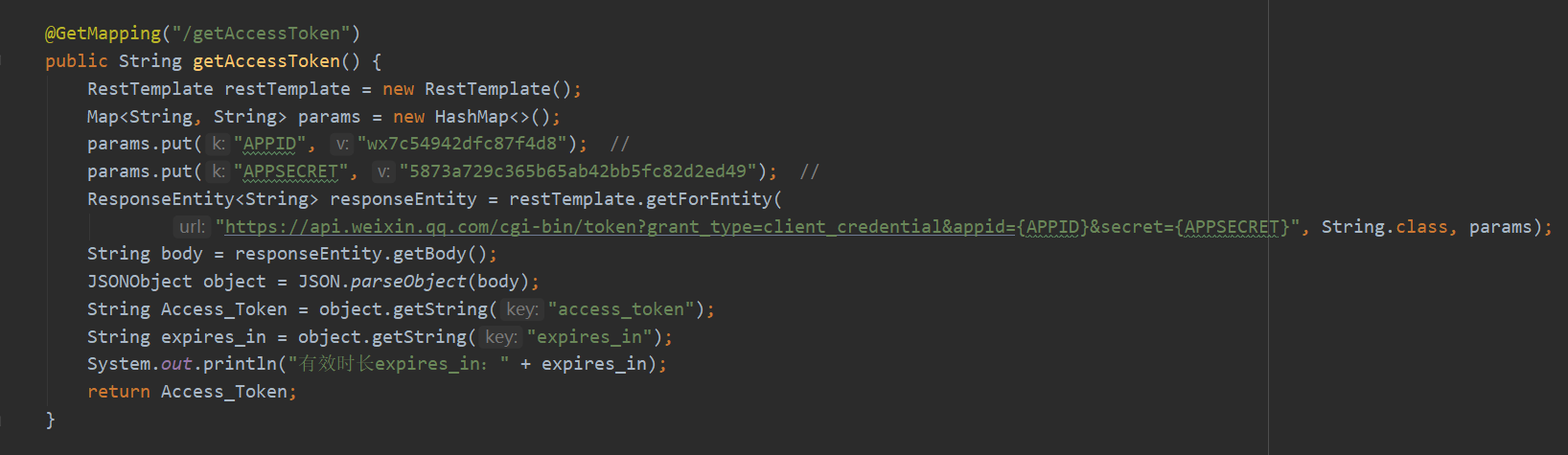 可以看出代码很简单,就是用RestTemplate来实现一个get请求,这样我们就可以轻松的获取到了access_token。