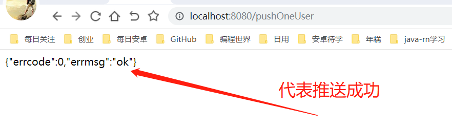 我们在浏览器里调用上面接口,可以看到下图所示,这样就代表我们消息推送成功了。