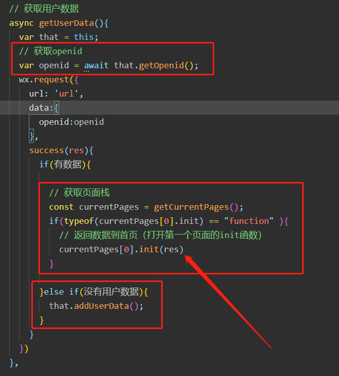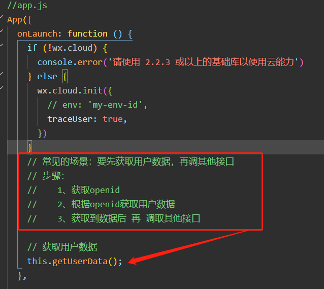 // 常见的场景:打开小程序时要先获取用户数据,再调其他接口