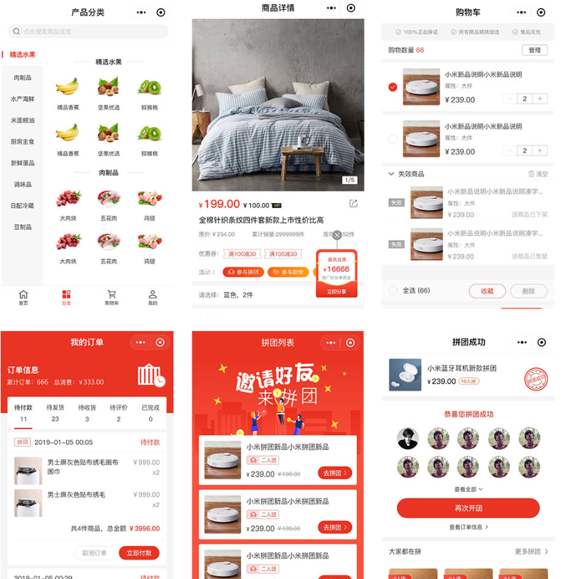 产品功能:常见的首页,分类,购物车,个人中心必须安排上,这些基础上要有地址管理,账号登录,订单通知,产品规格,产品评价等。还要有一些常用的营销功能,比如砍价,拼团,秒杀,优惠券,可以更好的刺激用户购买下单,当下比较火热的社交推广分销功能也要备齐,还有一个强大的功能,就是自定义设置表单功能,非常快捷方便,说到这里,我已经按捺不住要给大家展示效果图了,还有演示站等,