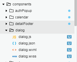 示例dialog组件也由4个文件构成,与page文件类型相同,但是js文件和json文件与页面有所不同。