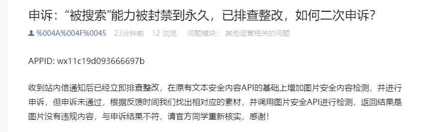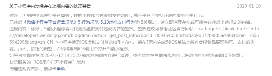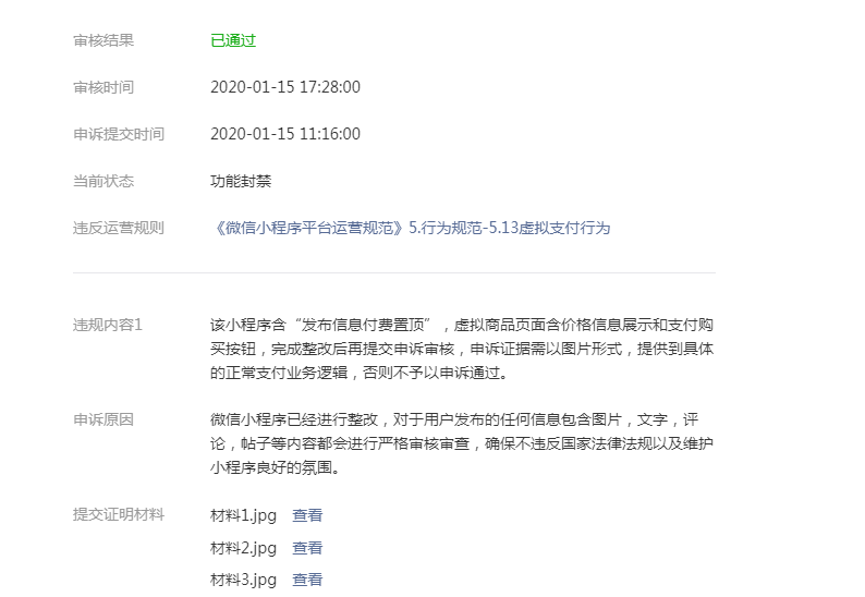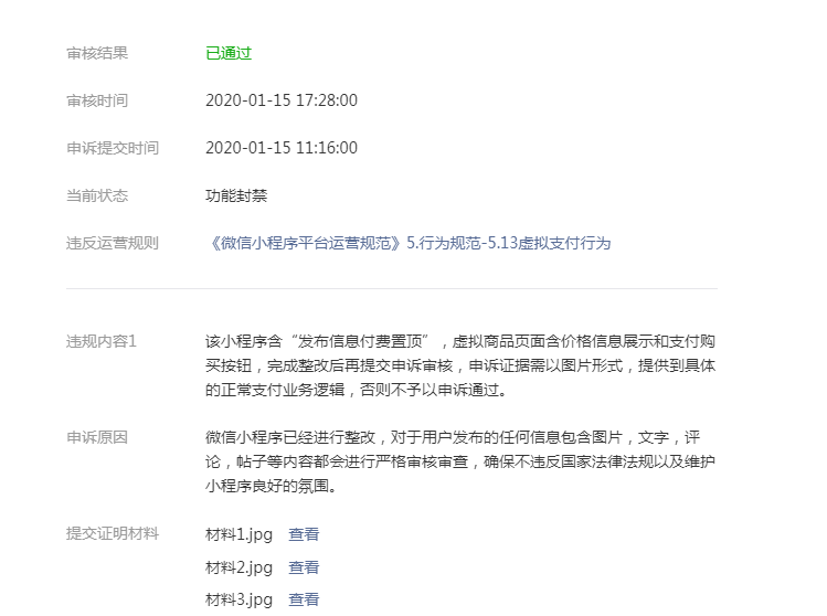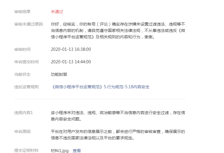今天终于找到可以联系到官方沟通的地方,所以还希望一定要看到我的问题,求解答!!!拜托拜托!如果小程序已经没有问题,希望可以帮我们解除封禁,以及去掉我们的违规记录,感谢!!!