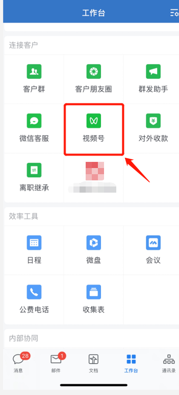 第一步:进入企微「工作台」点击「视频号」