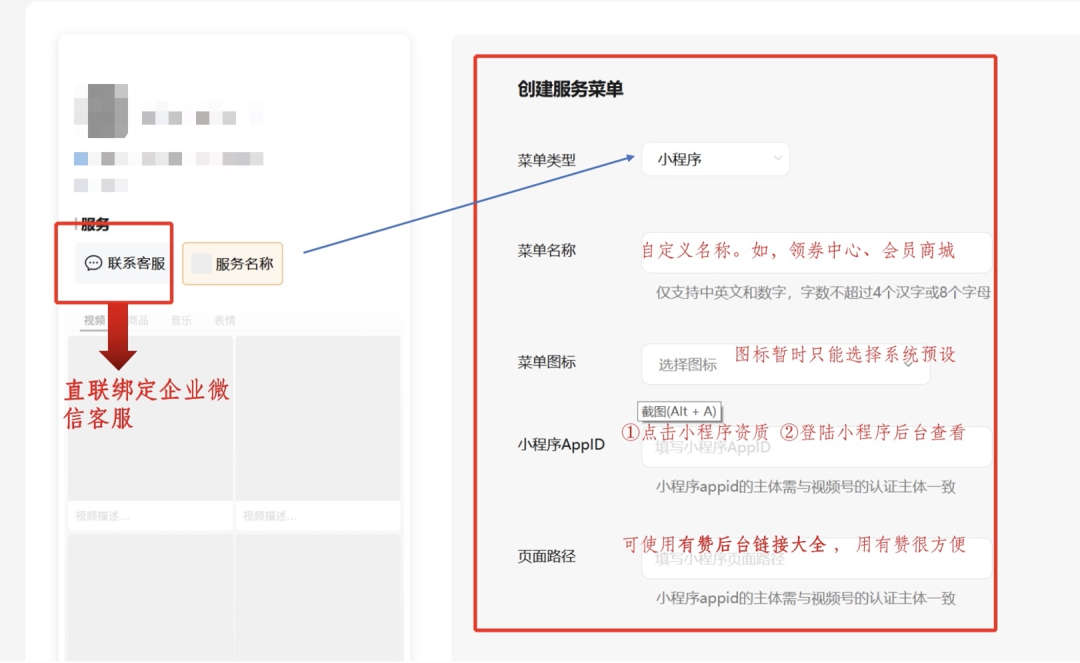 这里的自定义服务菜单配置,我们可以选择添加「小程序」和「企业微信」