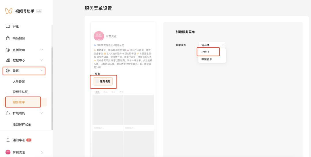已通过企业认证的视频号,可在主页添加「服务菜单」功能,支持直接跳转小程序。主要步骤如下: