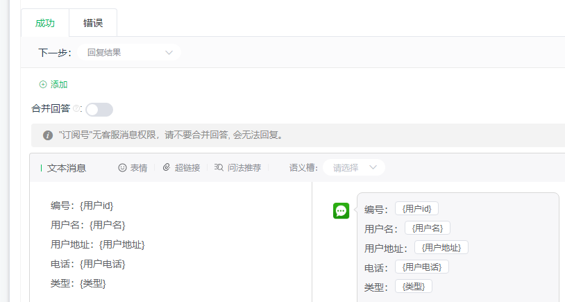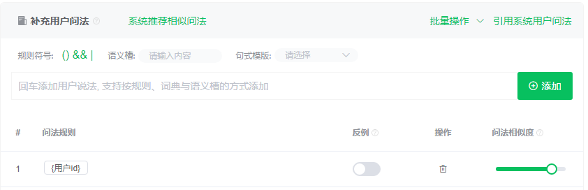 3:在用户问法中输入:{用户id},这样当用户发送用户编号给机器人时系统才能匹配到。