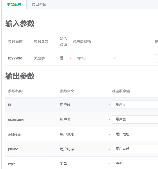配置接口的作用是让输入参数和输出参数与定义好的语义槽进行对接。系统才能把数据传递和填充到对应的语义槽。
