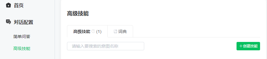1:在“高级技能”中创建“查询用户”的技能,并创建对应的意图。