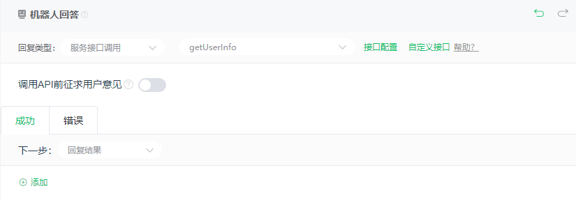 1:在机器人回答部分选择服务接口调用,并自定义接口。