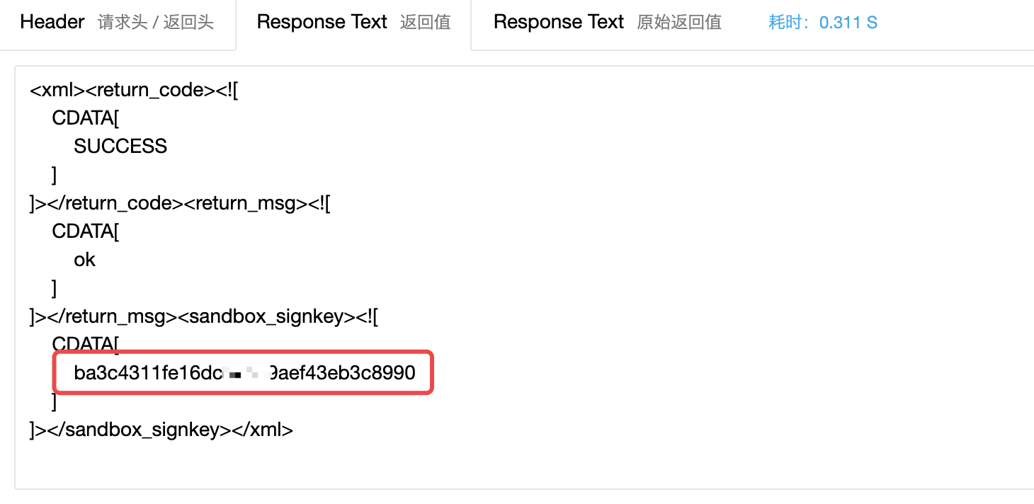 在成功返回的结果中sandbox_signkey参数就是沙箱秘钥。