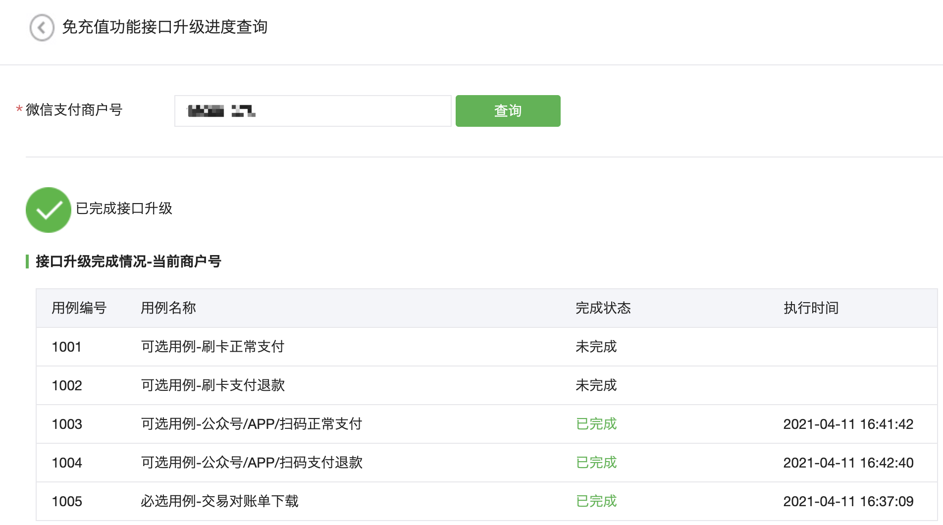 完成以上操作,即可完成微信免充值代金券1003项公众号/APP/扫码正常支付的接口升级。