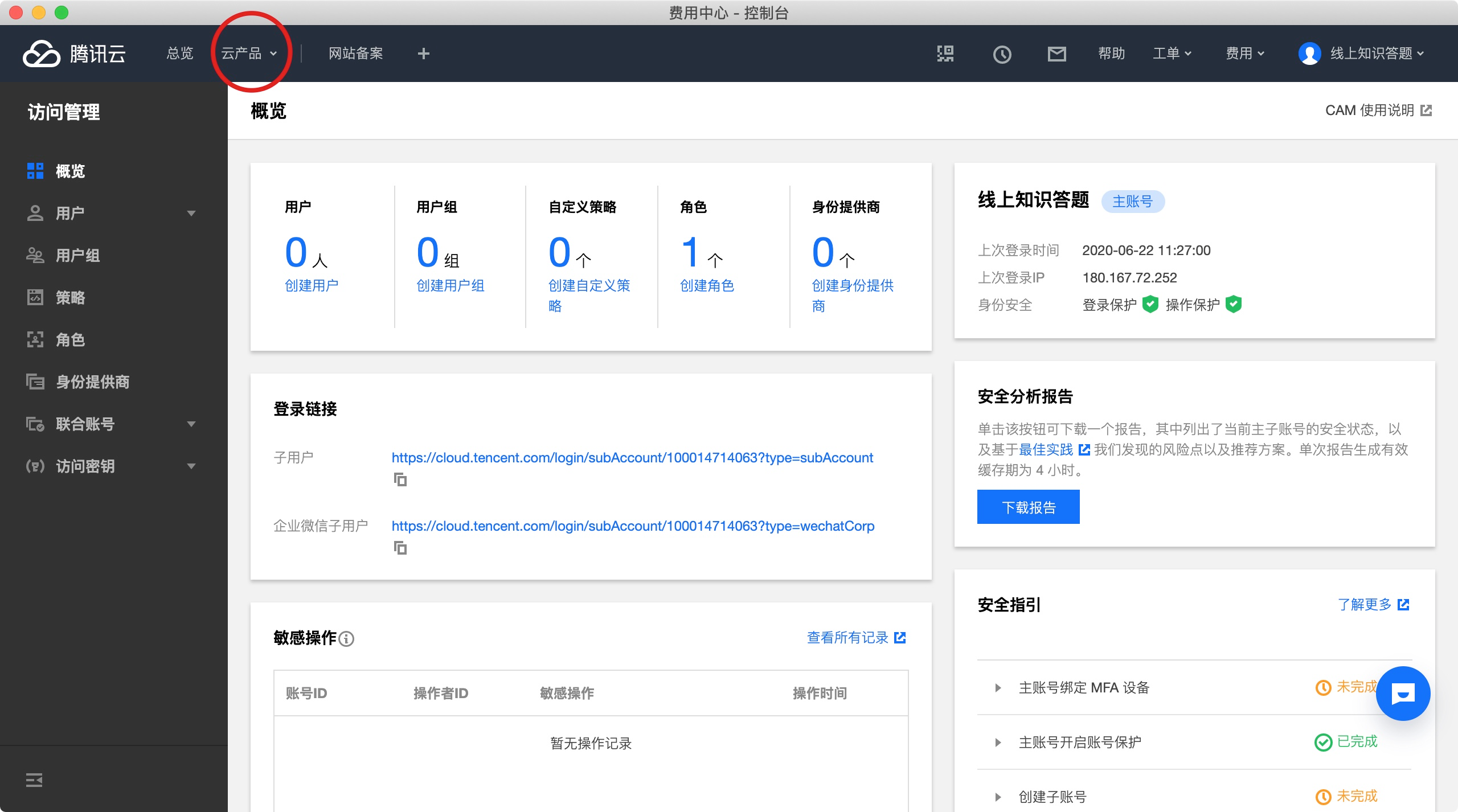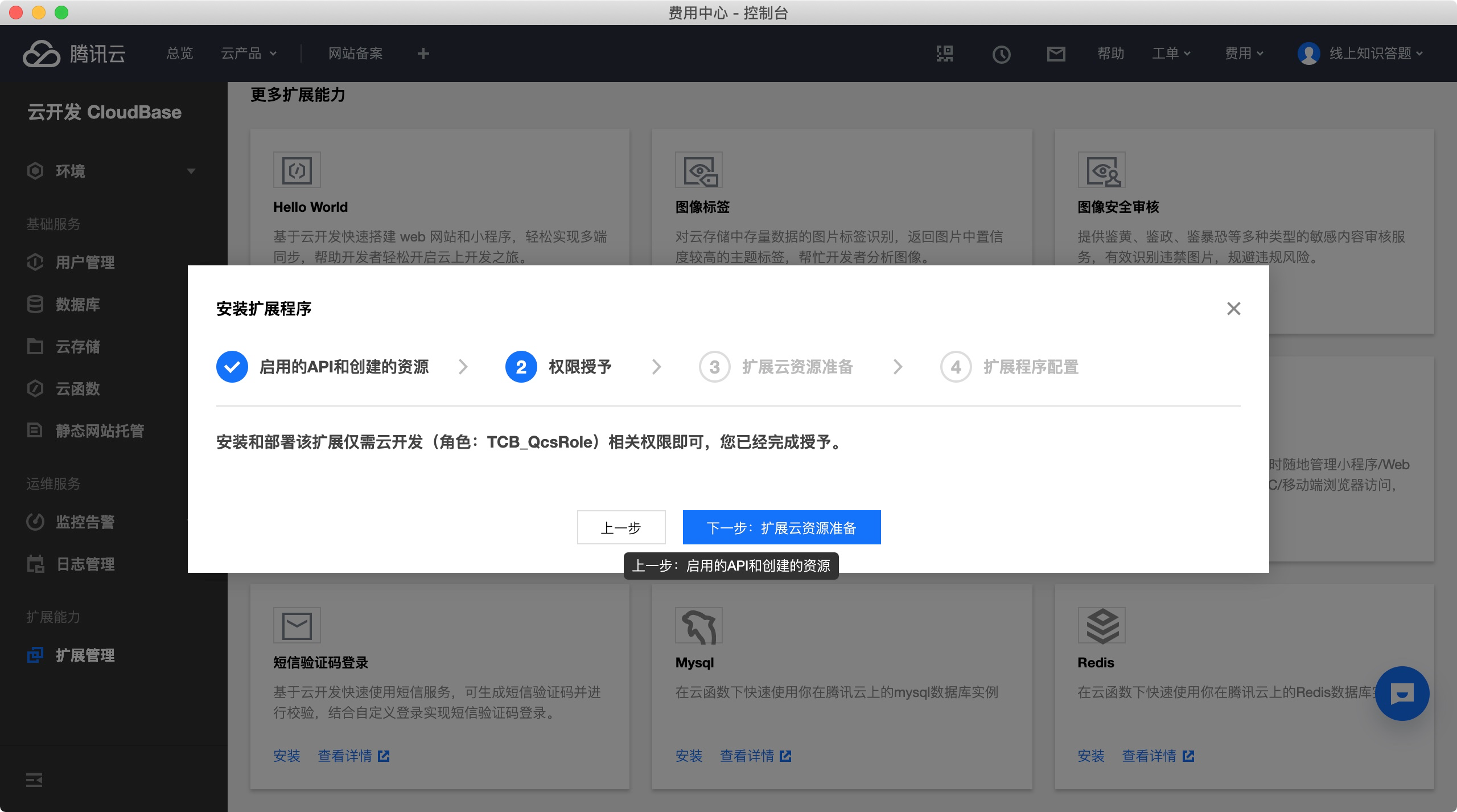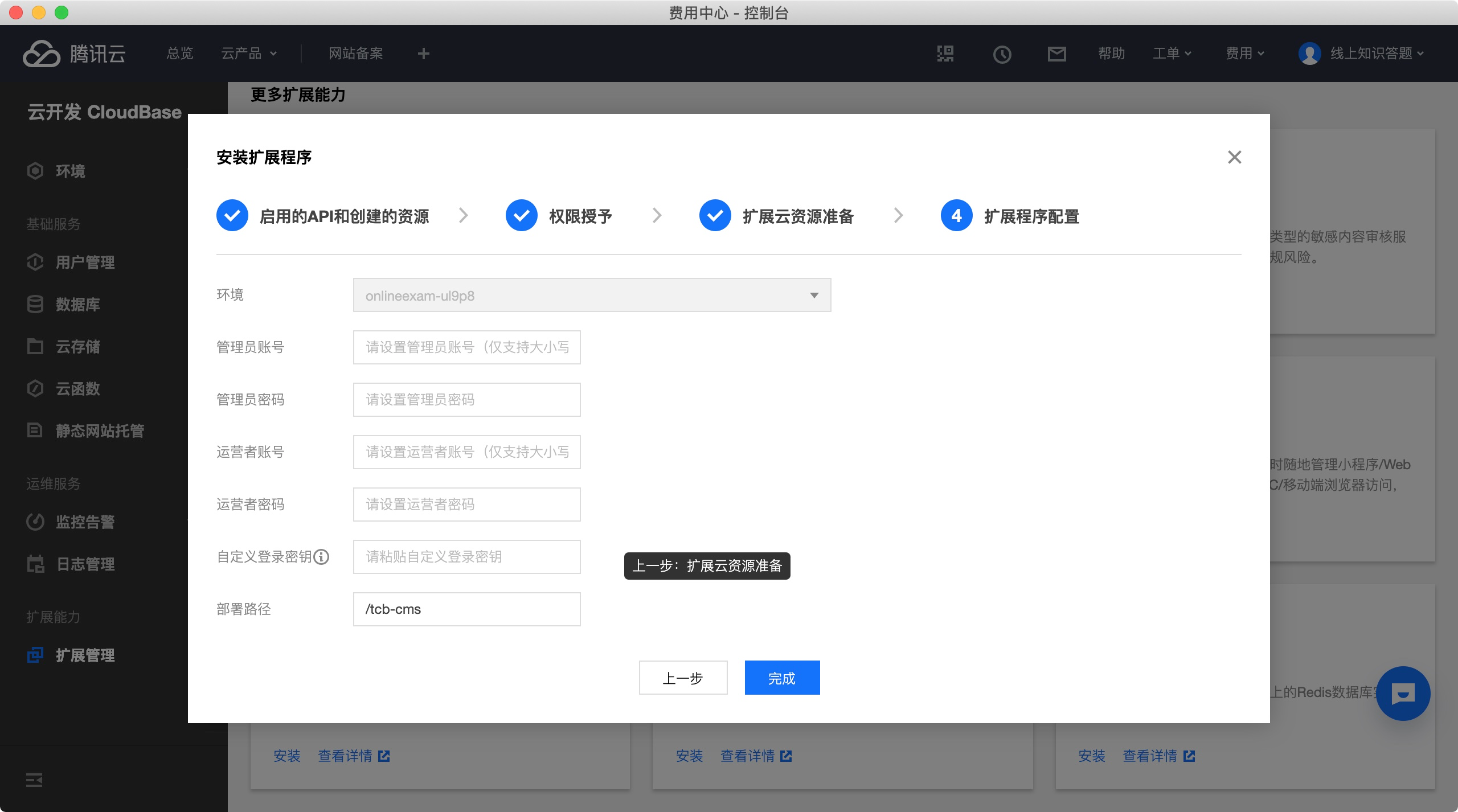 由于这里需要下载密钥~~,在云开发控制台不能完成,从这一步开始切换到腾讯云web