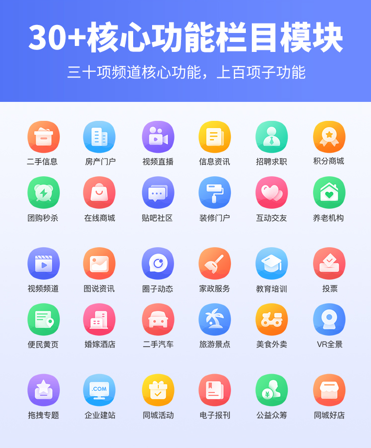 包含功能:信息资讯、二手信息、房产门户、招聘求职、贴吧社区、在线商城、美食外卖、团购秒杀、视频直播、同城活动、养老机构、教育培训、旅游频道、婚嫁频道、家政服务、汽车、装修、拖拽专题、互动交友、电子报刊、自助建站、便民黄页、投票活动、积分商城、VR全景、视频频道、图说资讯、圈子动态(抖音圈子)、微信小程序、百度小程序、QQ小程序等