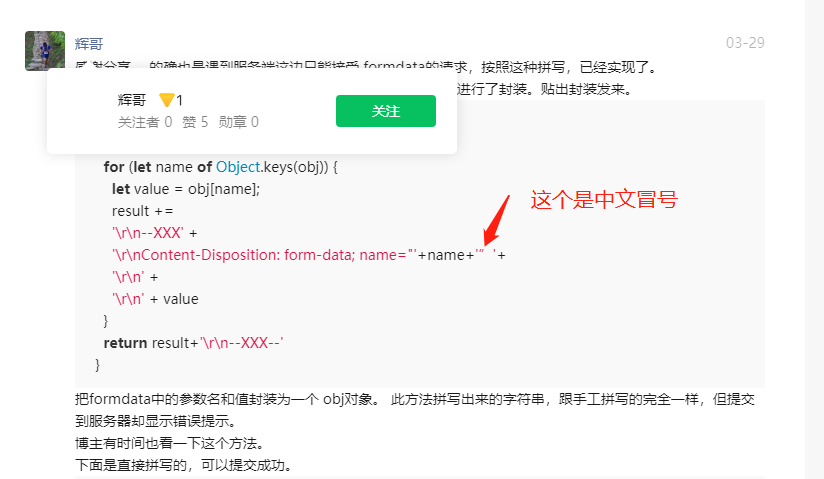 formdata (obj = {}) { let result = '' for (let name of Object.keys(obj)) { let value = obj[name]; result += '\r\n--XXX' + '\r\nContent-Disposition: form-data; name="'+name+'”'+ '\r\n' + '\r\n' + value } return result+'\r\n--XXX--' }