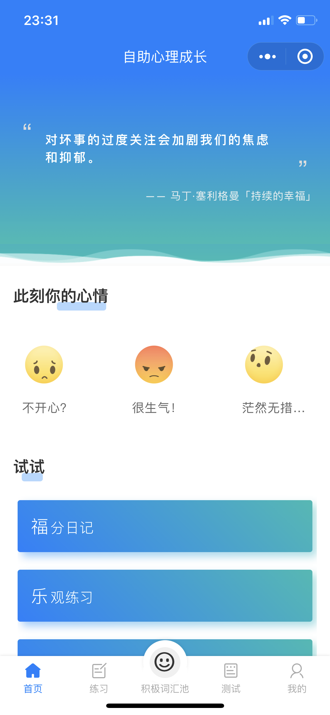 3.根据当前情绪推荐测试及练习。