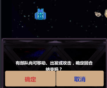 点击该按钮后系统会依次检查当前我方空域中的单位(包括母舰与编队),是否还有单位回合移动力尚存、是否还有单位未曾发动过攻击,同时还要检查母舰停机坪是否有准备待发的机甲编队,如果有任意一种情况则弹出窗口确认一遍; 没有、或确认结束回合的话进入到AI行动部分。 这里还有个小细节,如果当前战役中有盟军存在时不会立刻显示“敌方开始行动”,而是盟军先手行动,盟军行动完毕后才会显示“敌方开始行动”。 但是实质在我们确定回合结束那一刻就已经是AI行为来接管了,AI接管时的操作阵营顺序为:盟军——灰星军团——海盗军团......