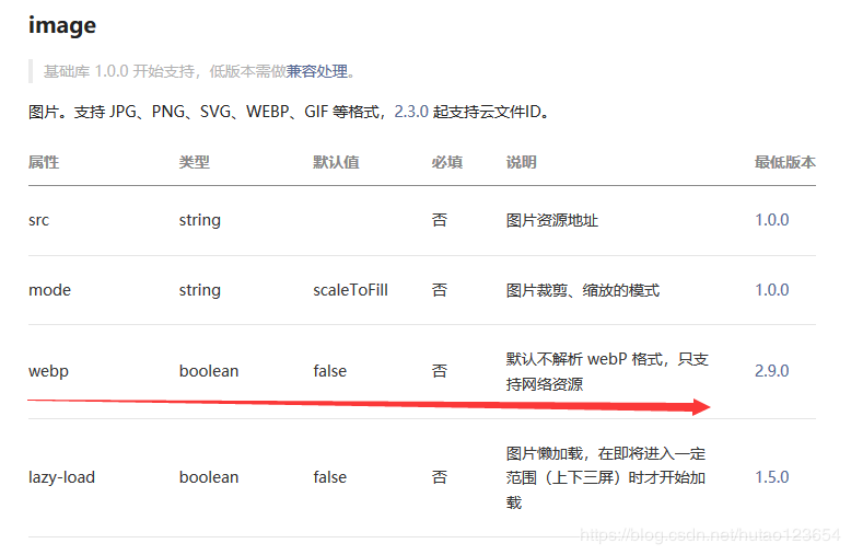 上面图片压缩已搞定,现在就要测试小程序端的显示效果了。一看发现,小程序Image组件默认无法显示webp格式图片,需要设置属性webp=true,说明如下图: