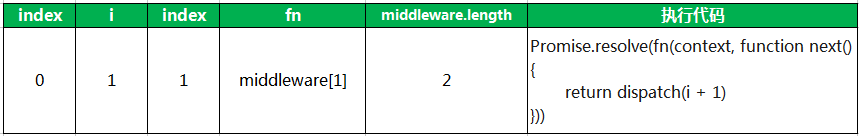 1:进入到next函数后,执行的是dispatch(1),于是老的dispatch(0)压栈,开始从头执行dispatch(1),即把第二个中间件函数交给fn,然后开始执行,这就完成了程序的控制权从第一个中间件到第二个中间件的转移。下图是执行dispatch(1)时函数内变量的值: