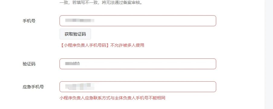 同一家公司多款小程序,每个小程序备案时需要至少三个手机号码即法人手机号码,负责人手机号码以及应急联系人手机号码;