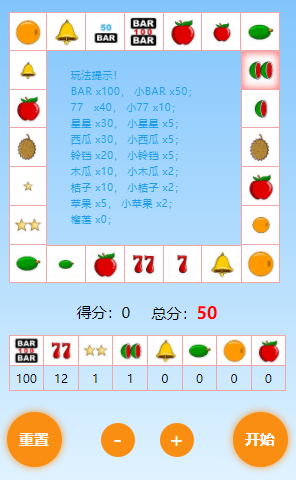物品:游戏中的物品有八种,分别为:苹果、西瓜、木瓜、橙子、铃铛、77、双星,这些物品又分为大小两种。还有BAR图标,分为2种。