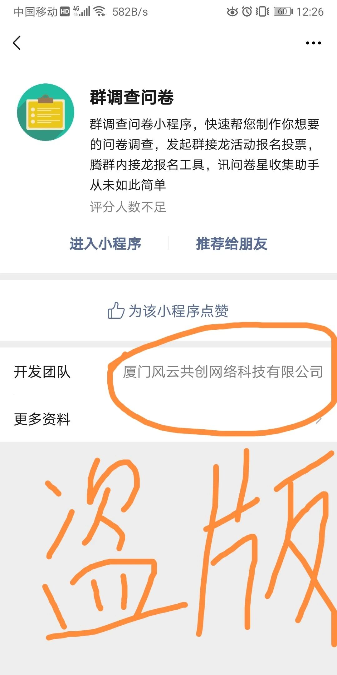 被盗版小程序的人发现了,先是自己下架了小程序,最后自己注销了,现在依然逍遥法外。