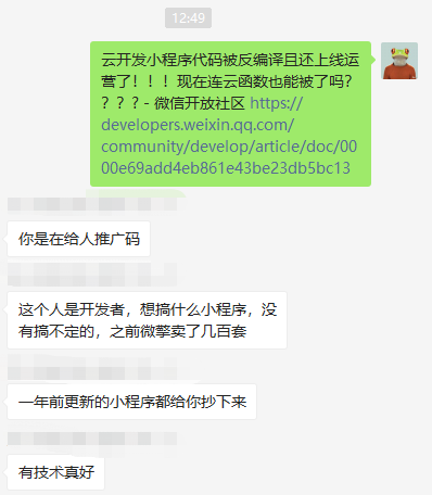 该小程序为云开发小程序,重要的逻辑都在云函数当中,如果单单是前端被反编译是不可以能运行的起来的。其中包括实体的创建(表和表的字段),提交问卷的复杂逻辑(我自己开发的我自己看都费劲)。所以请官方对反编译的小程序做出相应的处罚。同时修复云函数被反编译的漏洞。