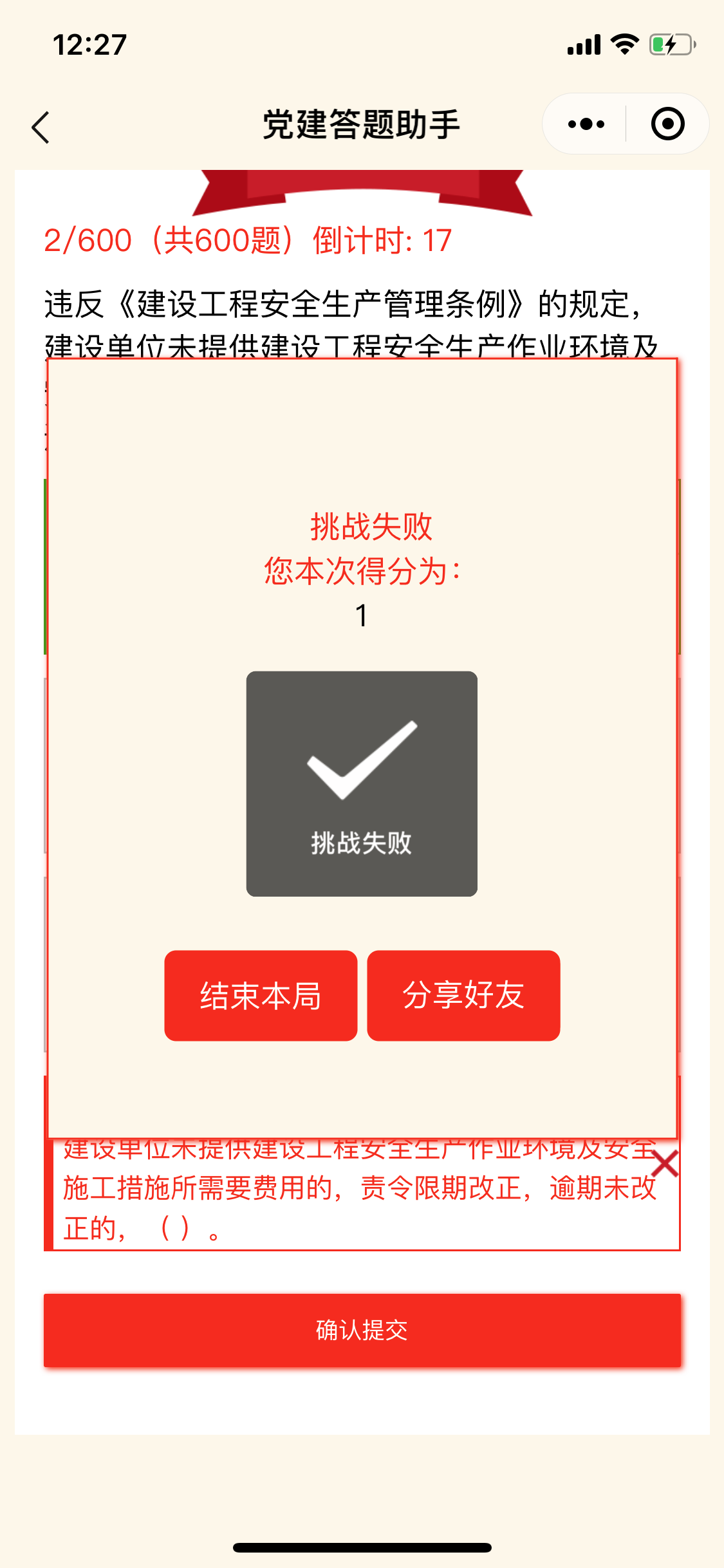 (2)用户挑战失败,有一次复活的机会,用户分享即可复活,复活成功后,接着原先的题继续作答,如果下次失败则结束挑战