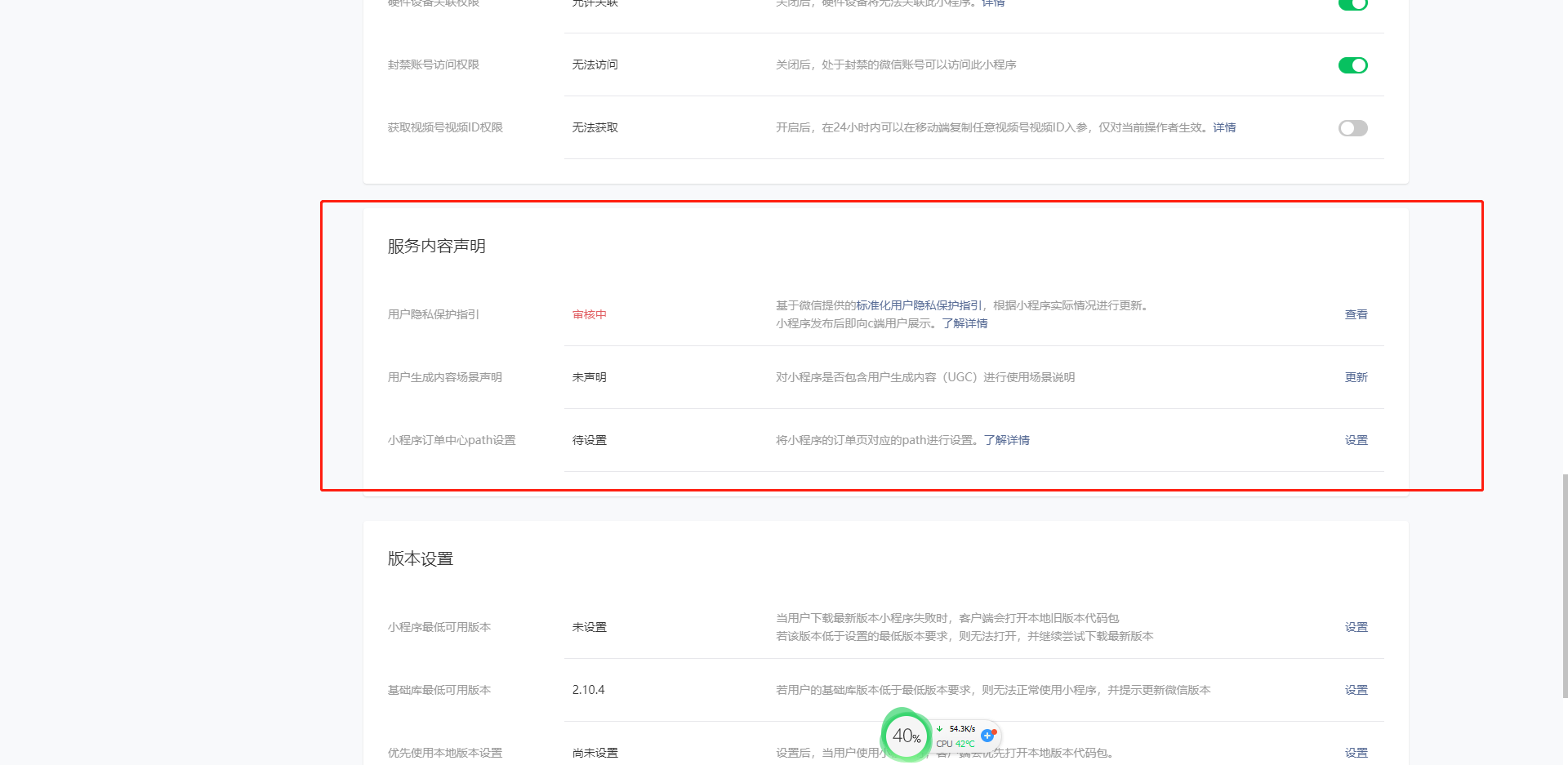 入口1:右上角小程序头像点击-设置页面-拖到下方服务内容声明块--去完善用户隐私保护指引