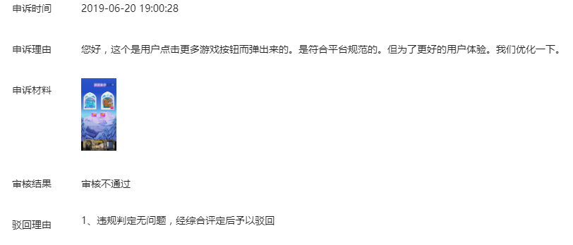 昨天,我们公司的一款小游戏的举报互推。 实际上是忘记点了更多游戏的按钮,弹出来的对话框。但我们也安装要求修改了,并提交审核通过了,第一次申诉不成功。 原以为是文字表达不够诚恳,第二次申诉还是不成功。