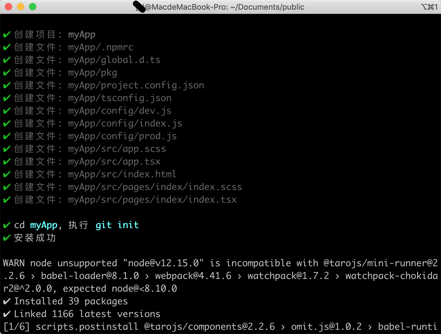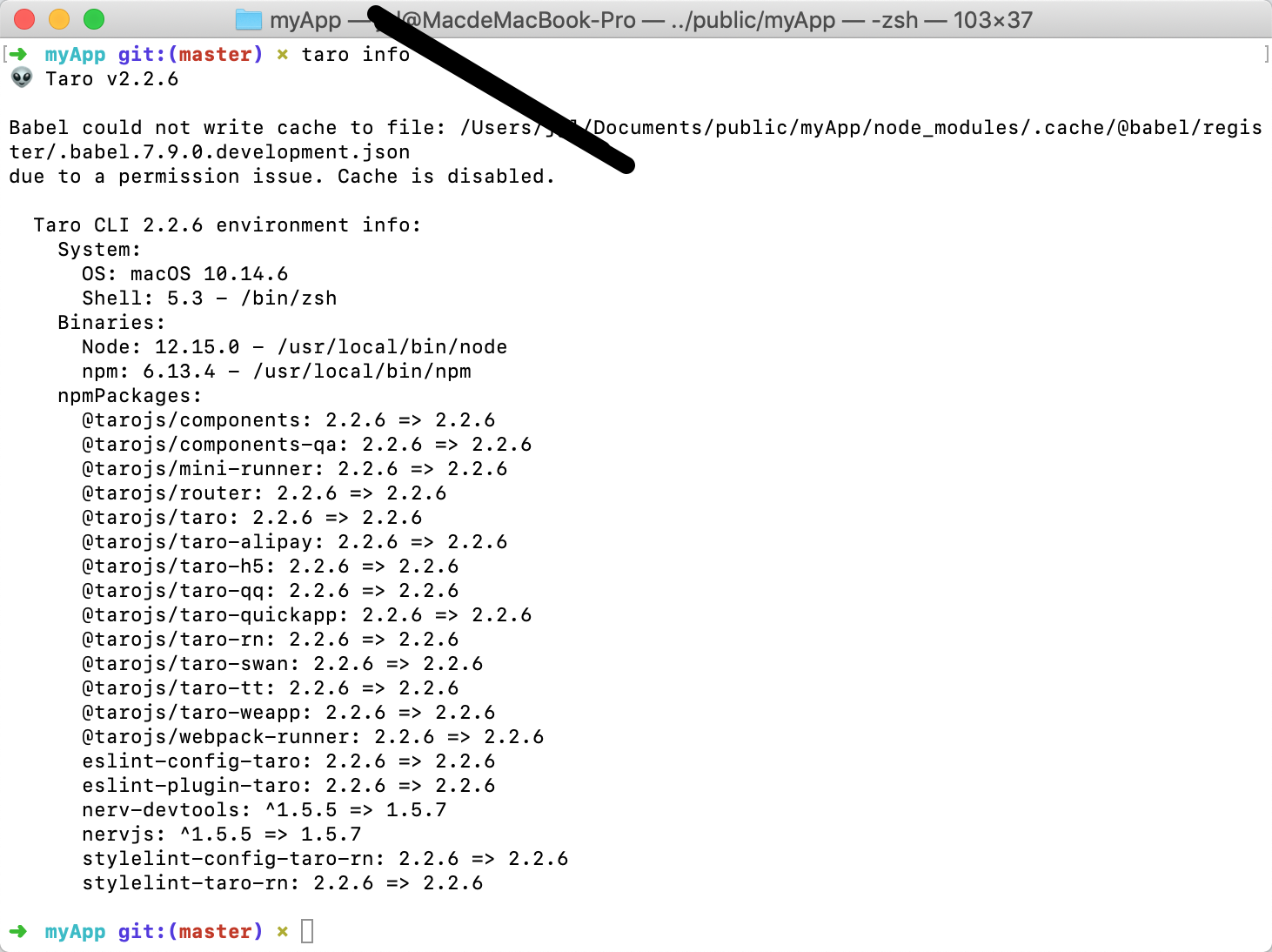 node版本检查,如下图所示,当前mac node版本为12.15.0,所以满足taro开发的node最低版本要求