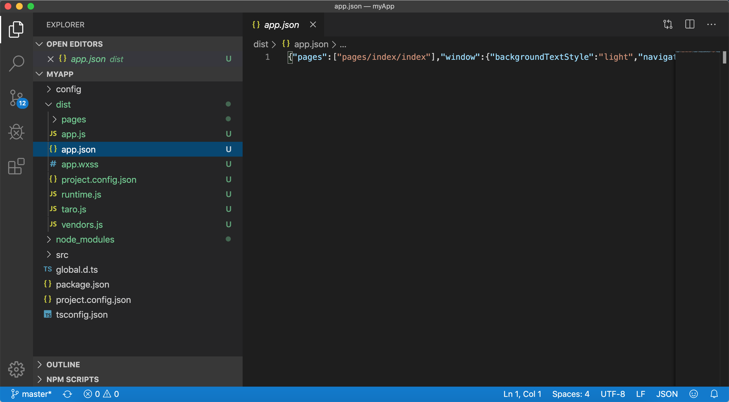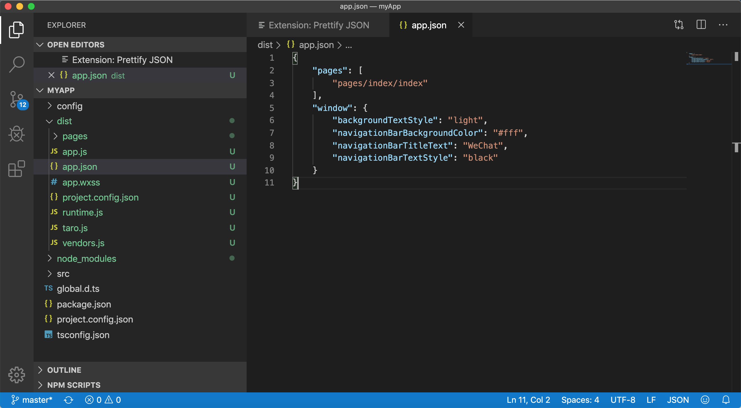 上述json文件格式化后,如下图所示,已经是原生小程序app.json代码了。