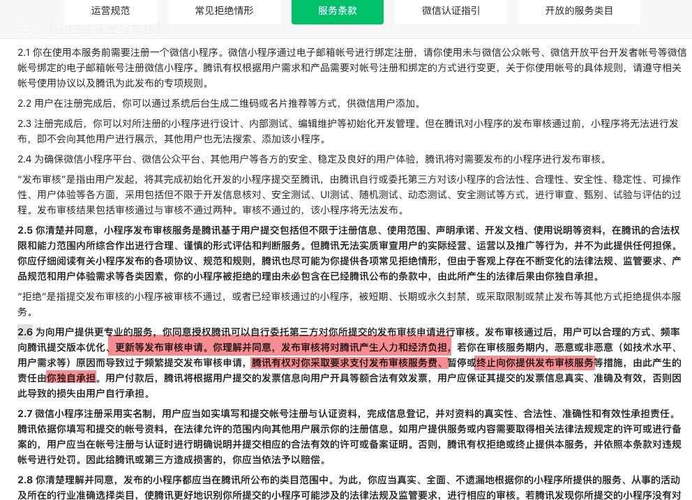 标红的意思大家细品下哈。 所以,在这里呼吁大家,写BUG的时候尽量写小点的BUG,别写太大的BUG,提审后需要紧急修复的话你得再提审。增加审核大大的工作量不说还可能影响到别人,其他小程序的审核效率。