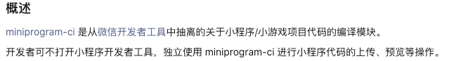 我一般会保持一周过一遍文档的习惯(量子阅读,手动滑稽~~),发现文档里出了一个叫做CI的东西,文档地址: https://developers.weixin.qq.com/miniprogram/dev/devtools/ci.html