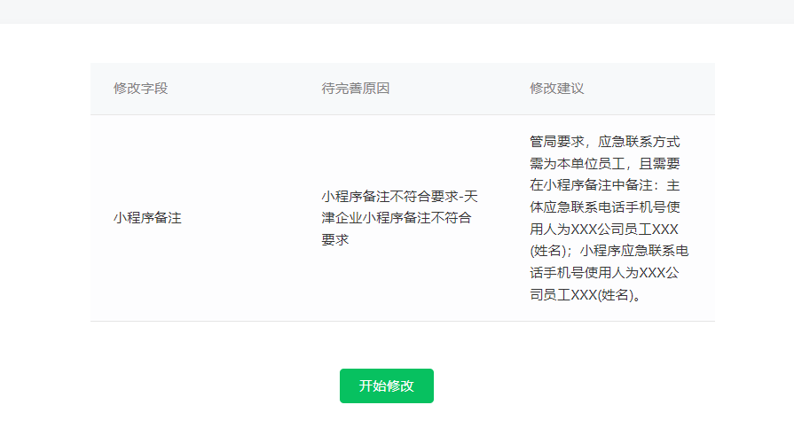 | 主体负责人应急联系方式 | 应急联系方式不符合要求-天津政企要求:一、应急联系方式需为本单位员工,二、应急联系方式需按要求备注 | 应急联系方式需为本单位员工,且需要在小程序备注中备注:应急联系电话手机号使用人为XXX公司员工XXX。 |