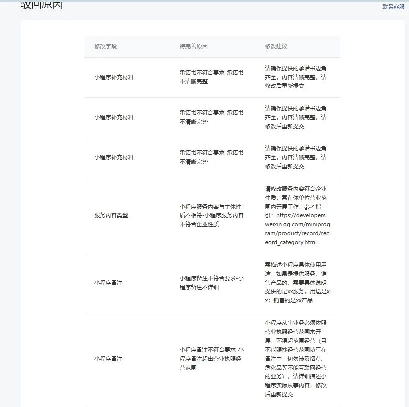 | 服务内容类型 | 小程序服务内容不符合企业性质 | 请修改服务内容符合企业性质,需在你单位营业范围内开展工作;参考指引:https://developers.weixin.qq.com/miniprogram/product/record/receord_category.html |