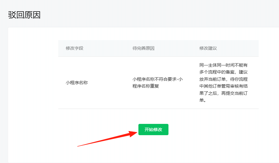 | 小程序名称 | 小程序名称与单位名称无关 | 你单位的小程序名称与当前主体性质不符,请修改小程序名称,请确保需要与您当前备案主体相关联。 |
