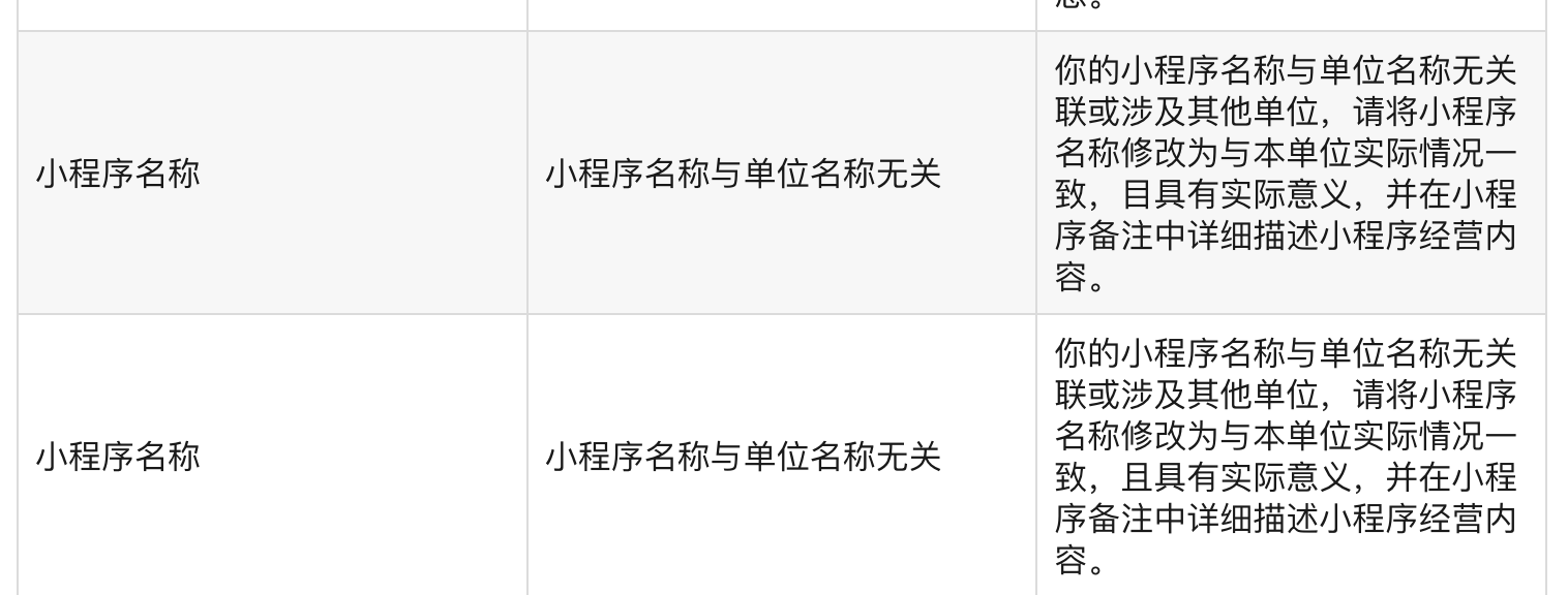 | 小程序名称 | 小程序名称不符合要求-小程序名称与单位名称无关 | 你的小程序名称与单位名称无关联或涉及其他地域或单位,请将小程序名称修改为与本单位实际情况一致,且具有实际意义,并在小程序备注中详细描述小程序经营内容。(如小程序名称为你单位的注册商标,请将商标证书上传至小程序其他材料接口。) |