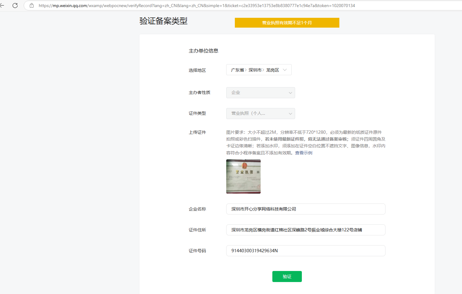 小程序无法备案 显示营业执照有效期不足一个月?但实际营业执照为长期有效.
