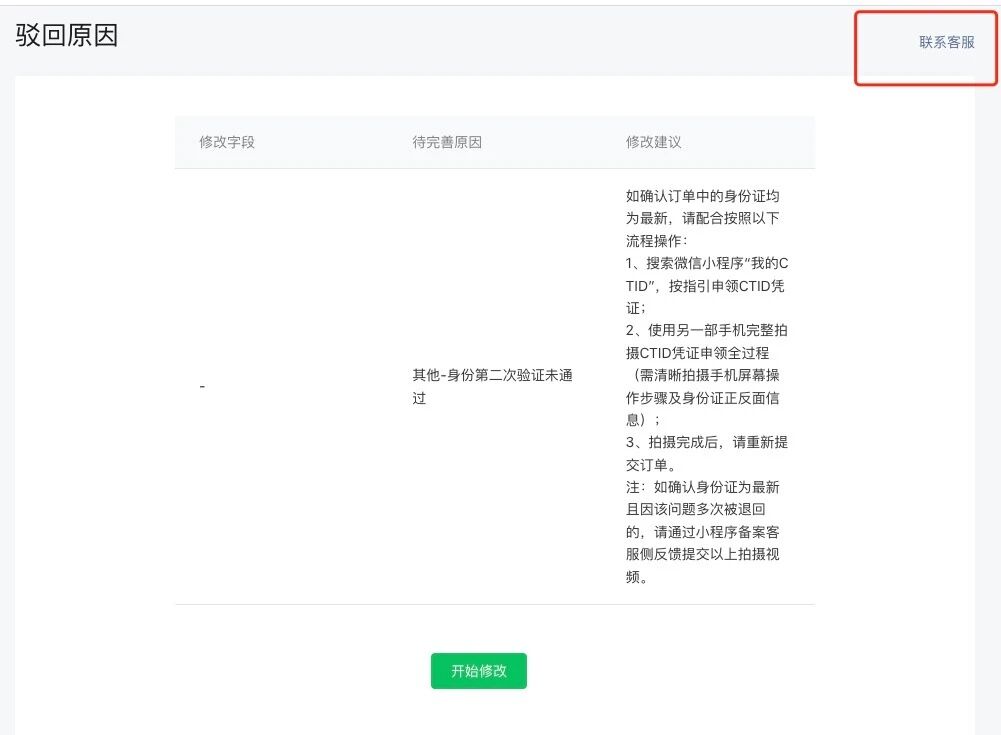 | 其他 | 身份验证未通过 | 请确保订单中小程序负责人的身份证必须为最新,请修改后重新提交;如确认订单中的身份证均为最新,请配合按照以下流程操作:1、下载CTID APP并使用nfc读卡方式开通网证,然后重新提交订单即可 2、重新提交后仍因此问题多次被退回的,建议咨询证件对应部门。 |