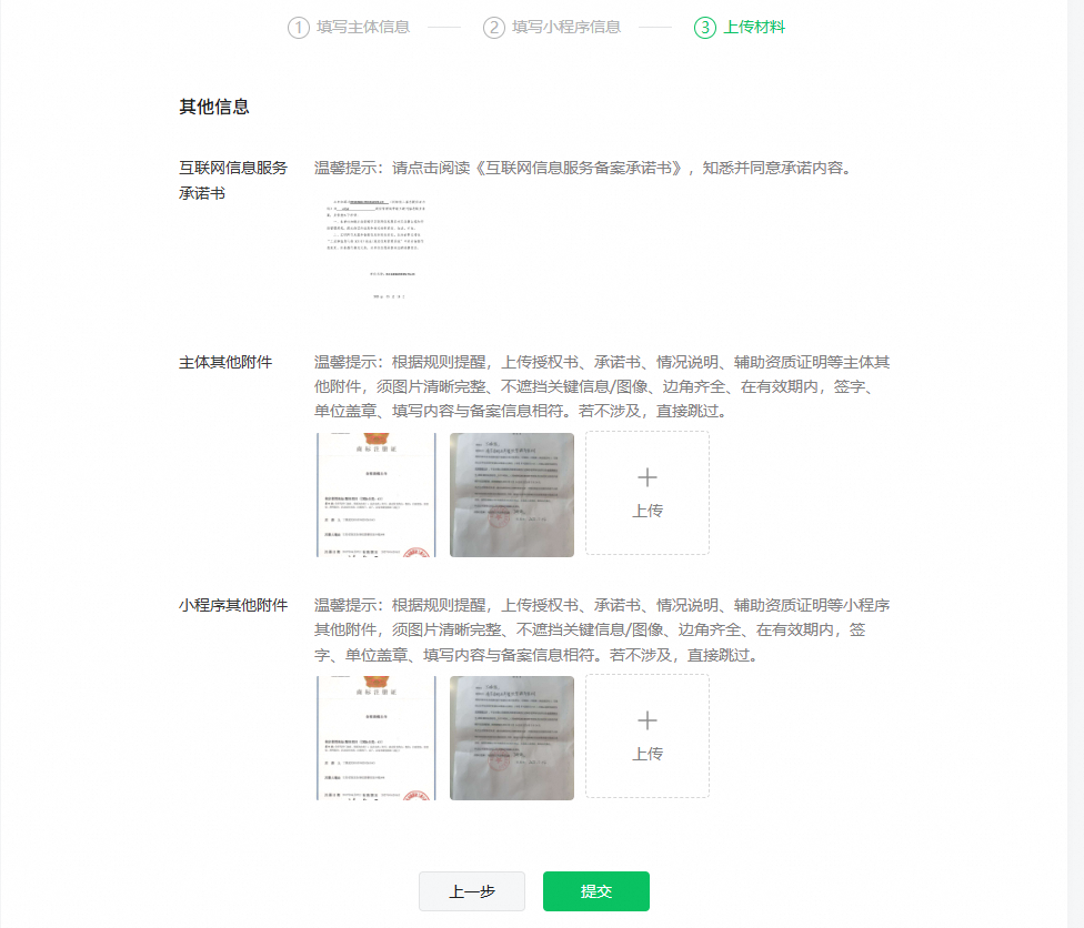 | 主体补充材料 | 补充材料上传位置错误 | 请将该材料上传至小程序 其他补充材料接口。 |