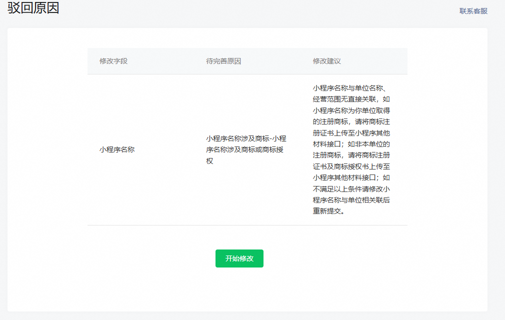 | 小程序名称 | 小程序名称与单位经营范围无关 | 你的小程序名称与企业经营范围无关联,请将小程序名称修改为符合企业经营范围,且具有实际意义,并在小程序备注中详细描述小程序经营内容。(如小程序名称为你单位的注册商标,请将商标证书上传至小程序其他材料接口) |