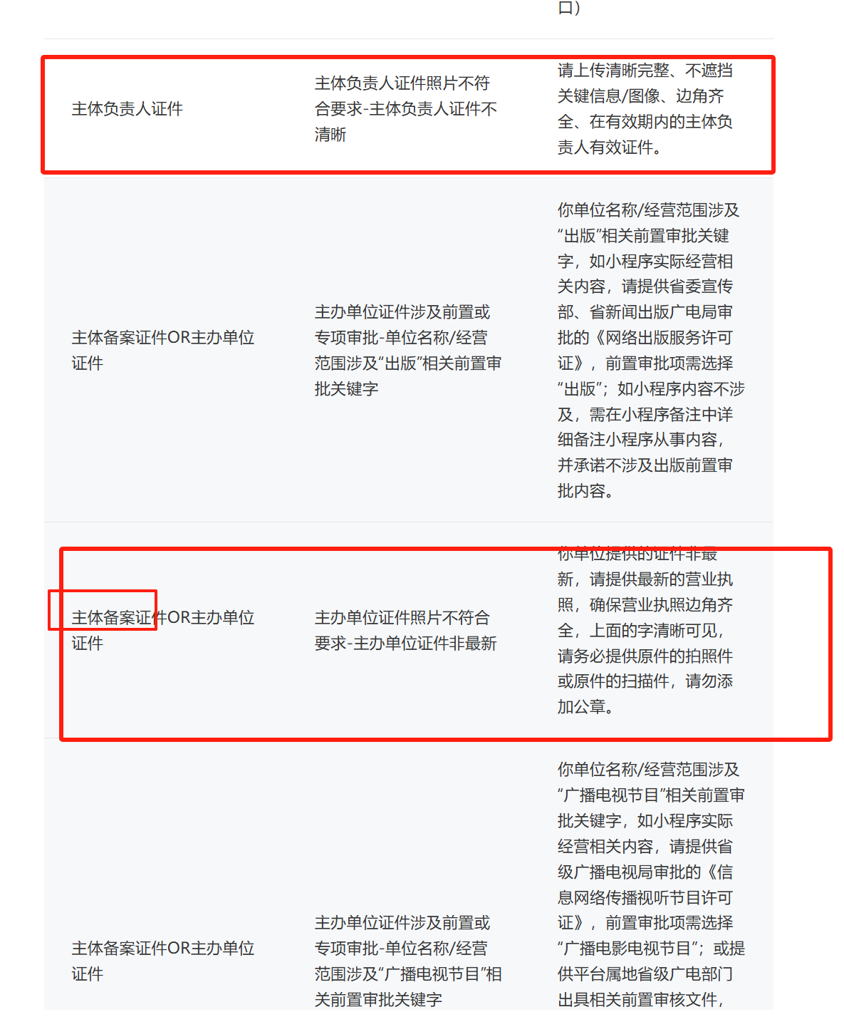 | 主体备案证件OR主办单位证件 | 主办单位证件照片不符合要求-主办单位证件模糊/ 不真实 | 请提供真实有效的主体证件,并提供在当地经营的有效证明(企业至少近期3个月以上的纳税证明或主体负责人及小程序负责人的当地社保证明),并将材料上传至小程序其他补充材料位置。 |