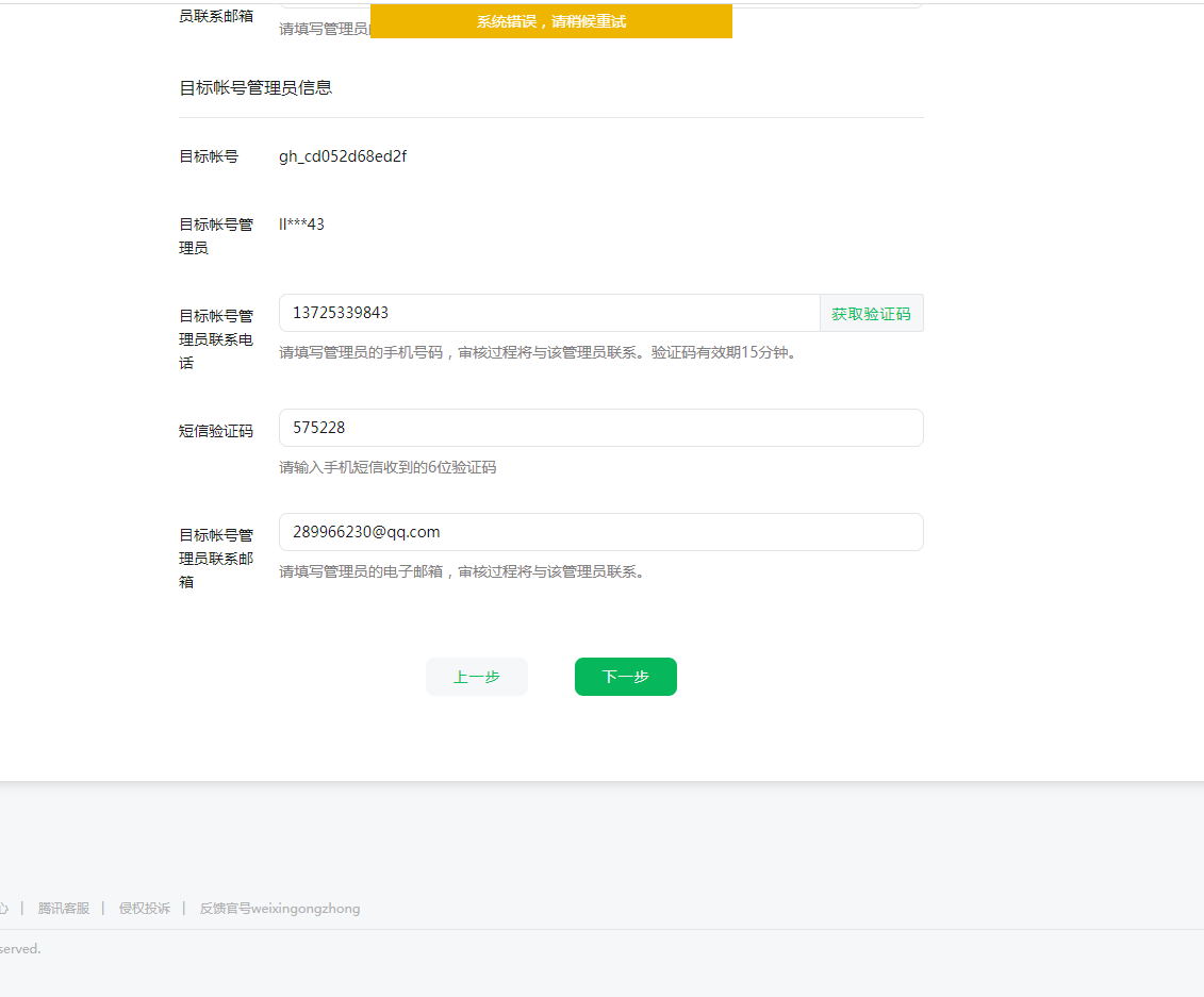 为什么填写资料下一步提示系统错误请稍后重试,重试了好多遍也不行