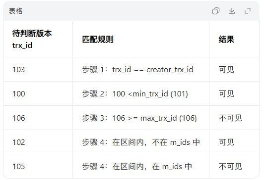 只要满足一条规则,就停止判断,得出最终结果。我们将待判断版本的事务 ID 记为trx_id(即该版本的DB_TRX_ID),判断步骤如下: